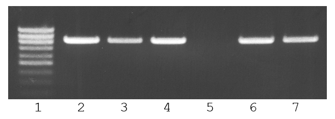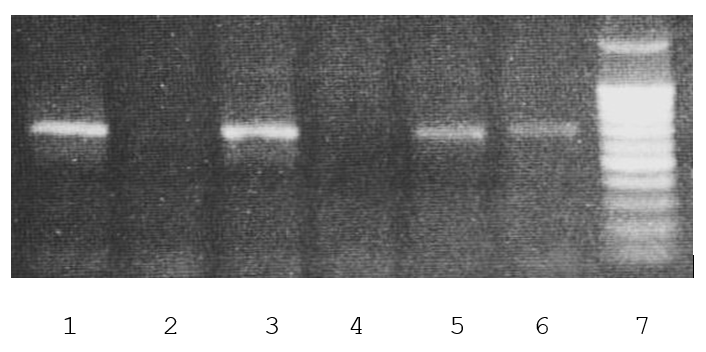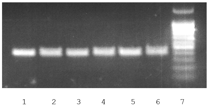 ПЦР-продукты разделялись путем электрофореза в 1,2 % агарозе “Low EEO, Type 1-A” (“Sigma”, США) в трис-ацетатном буфере (40 mM Трис-ацетат, pH 8,0; 1 mM ЭДТА). После проведения электрофореза ДНК визуализировали бромистым этидием и фотографировали в УФ-свете. Для оценки длин фрагментов использовали ДНК-маркер «100 bp».